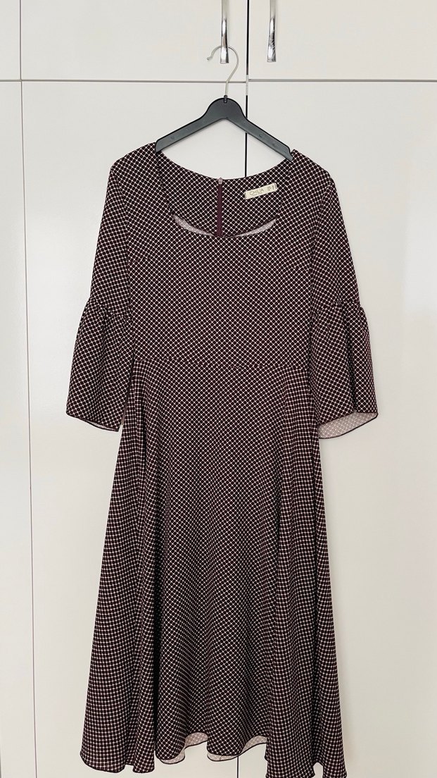 Bordo renkli, puantiyeli midi elbise, bol kesim ve pile detaylıdır. Kısa kollu, bisiklet yaka, günlük sokak stiline uygun retro tarzda bir üründür.