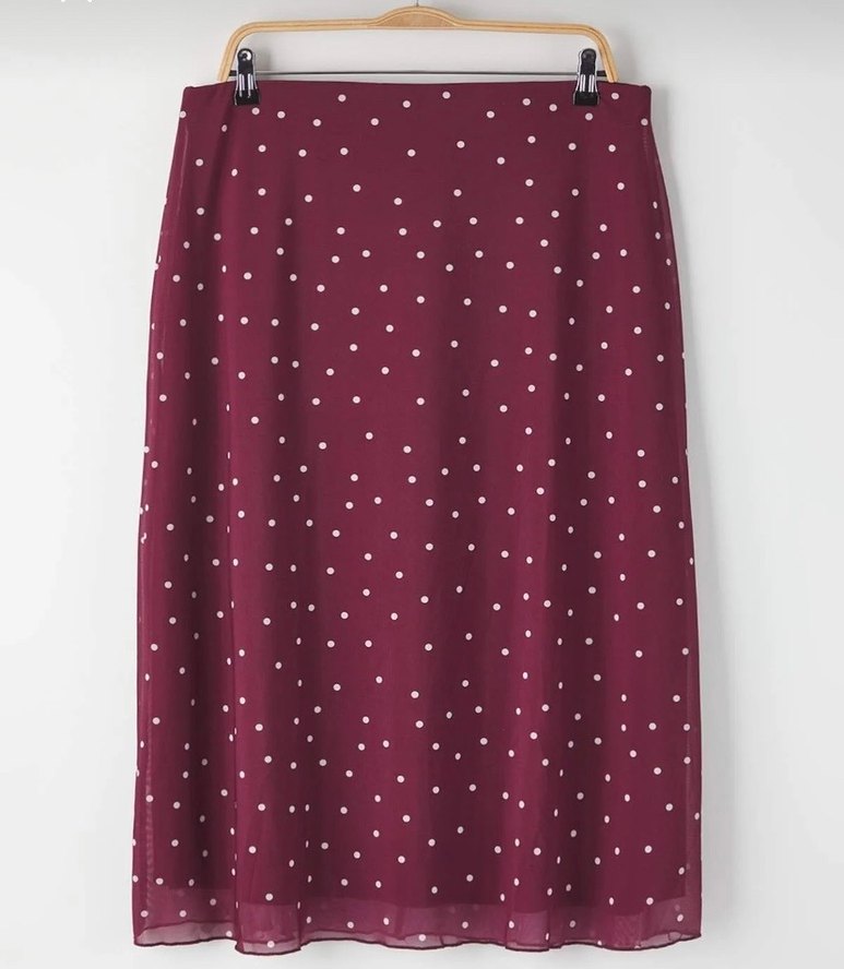 Bordo renkli, puantiyeli midi etek, bol kesim ve drapeli detaylarla, yumuşak sentetik kumaştan günlük kullanıma uygun.