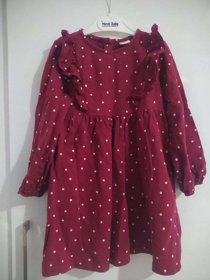 Bordo renkli, renkli puantiyeli, uzun kollu ve fırfırlı detaylara sahip kız elbisesi. Yumuşak ve sıcak kumaştan, bol kesim rahatlığı sunar.