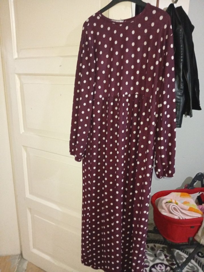 Bordo renkli, beyaz puantiyeli uzun ve salaş kesim elbise. Uzun kollu ve V yaka, yumuşak sentetik kumaştan. Günlük bohem tarz için uygun.