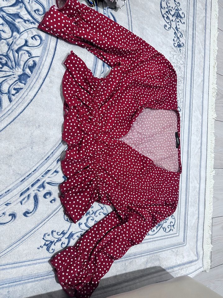 Bordo Puantiyeli V Yaka Bluz