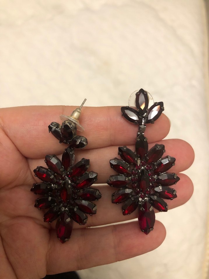 Bordo renkli, pul işlemeli ve desenli gotik midi küpeler, romantik akşamlar için cesur bir tarz sunar.