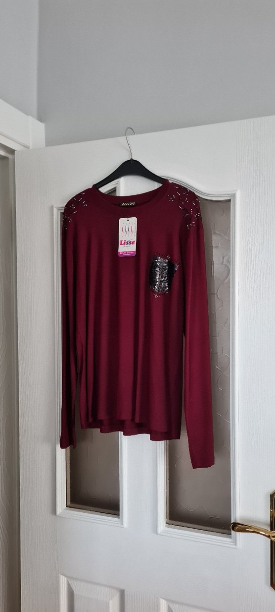 Bordo renk, uzun kollu, triko kumaştan, rahat kesim ve yuvarlak yakalı bluz. Pul işlemeli detaylar ve baskılı desenler içerir.