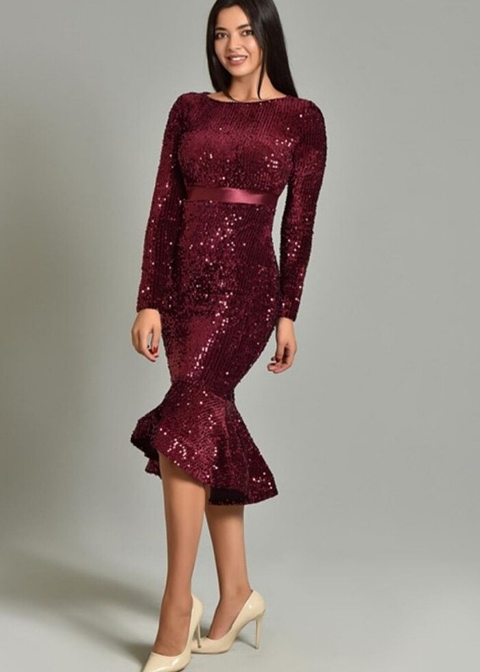 BORDO PUL PAYET SATEN KUŞAK ELBİSE