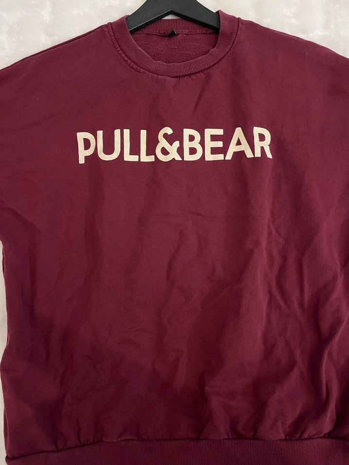 Bordo renkli Pull&Bear sweatshirt, yuvarlak yaka ve uzun kolludur. Bol kesimi ve önünde baskılı logo bulunur. Yumuşak ve sıcak kumaştan üretilmiştir.