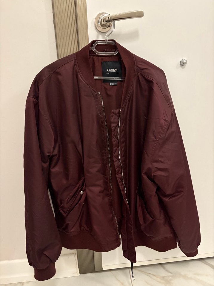 Bordo renkli, fermuarlı, notched lapel yakalı ve uzun kollu kadın ceket. bol kesim, günlük rahat kullanıma uygun hic bir sıkıntısı yok