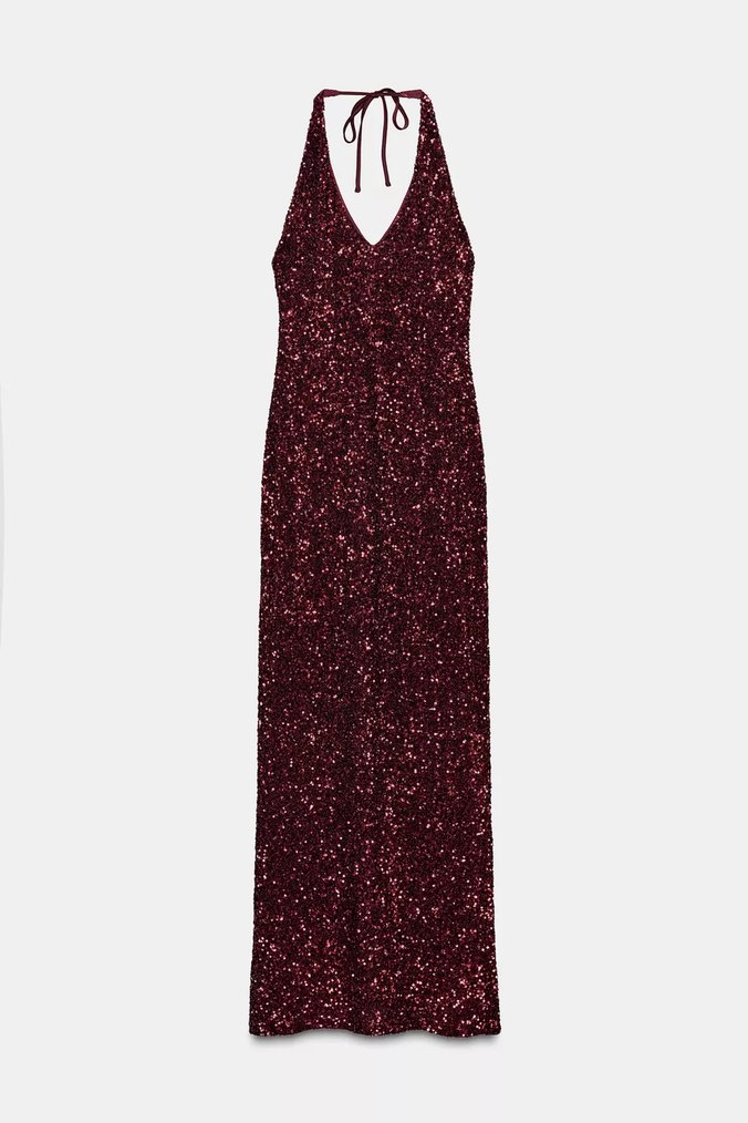 Bordo simli, uzun ve v yaka detaylı, askılı, vücuda oturan elbise. Cesur ve gösterişli tarz için ideal. ✨