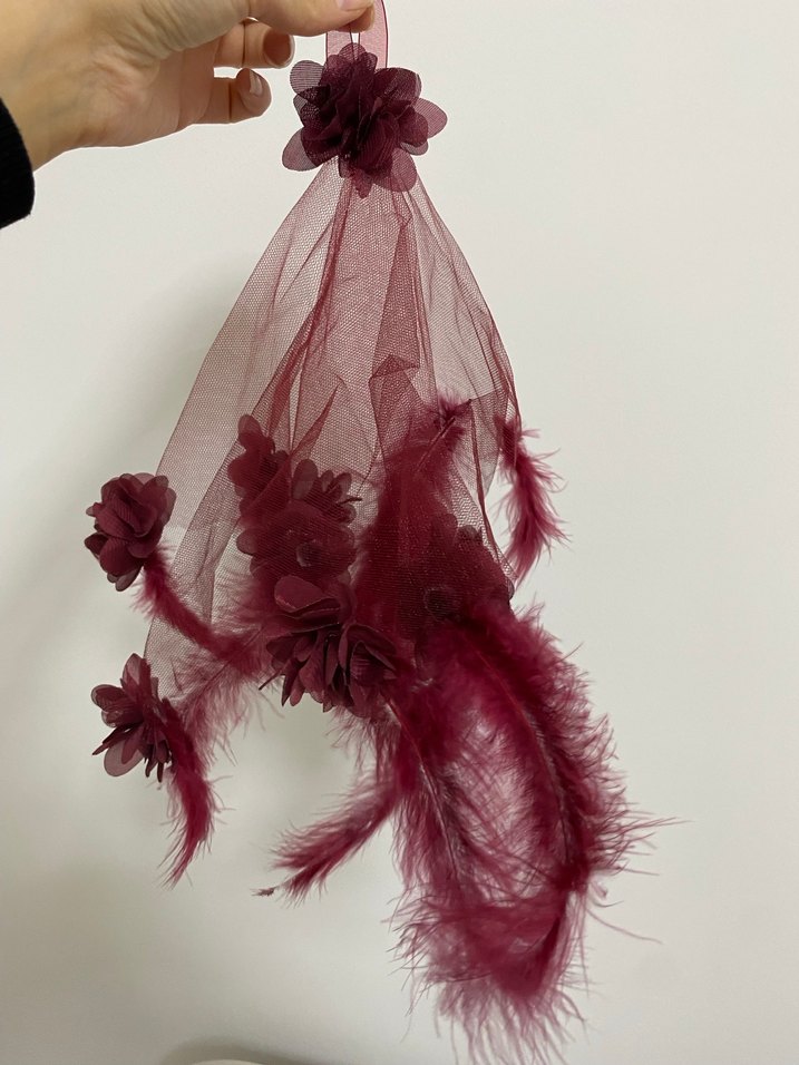 Bordo renkte, tül üzerine püskül ve çiçek detaylarıyla bohem ve avangart tarzda gelin aksesuarı. Trendsetterlar için uygun.