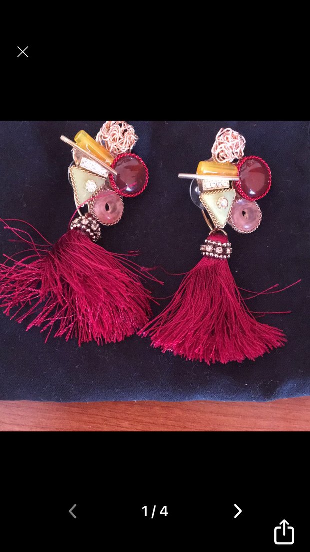 Bordo püsküllü, renkli nakış detaylı, bohem ve retro tarzda kadın küpe. Parti için kısa boy tasarım.