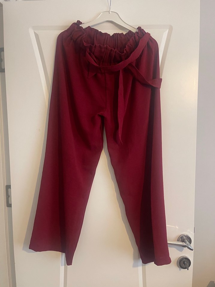Bordo renk, rahat kesim ve drapeli detaylara sahip uzun ayrobin kumaş pantolon, yumuşak sentetik kumaştan üretilmiştir,günlük ve rahat stil için uygundur.Marka temsili.