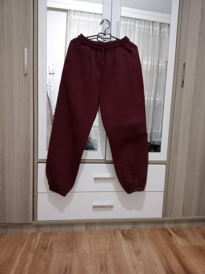 Kadınlar için bordo renkli, tamamen pamuk rahat kesim ve orta boy uzunlukta, yumuşak ve sıcak pamuk kumaştan eşofman altı. Bunun kahverengiside var ama satmakta emin değilim. isteklere göre düşünücem.