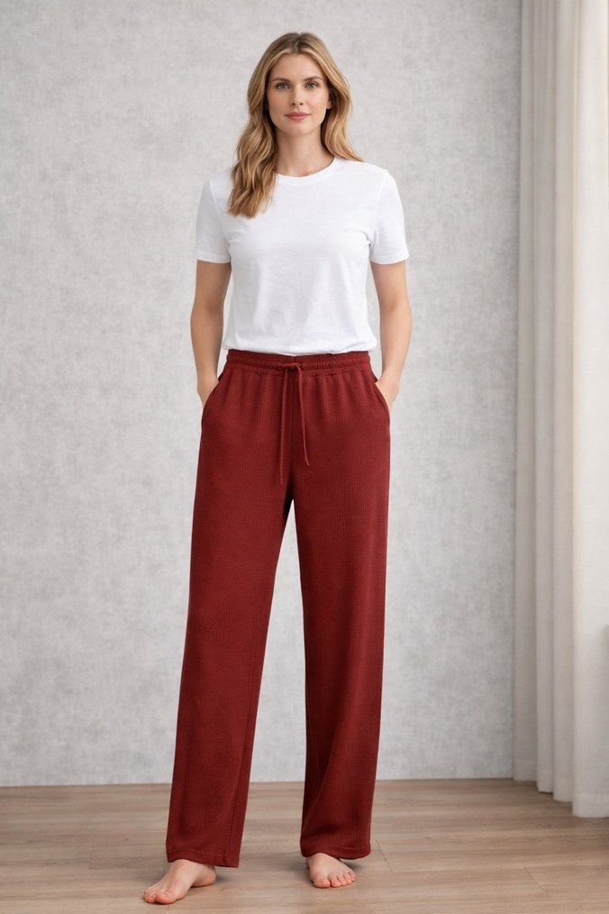 Bordo renk, rahat kesim ve midi boyda olan bu pantolon, yumuşak ve sıcak kumaşıyla günlük rahat şıklık sunar.