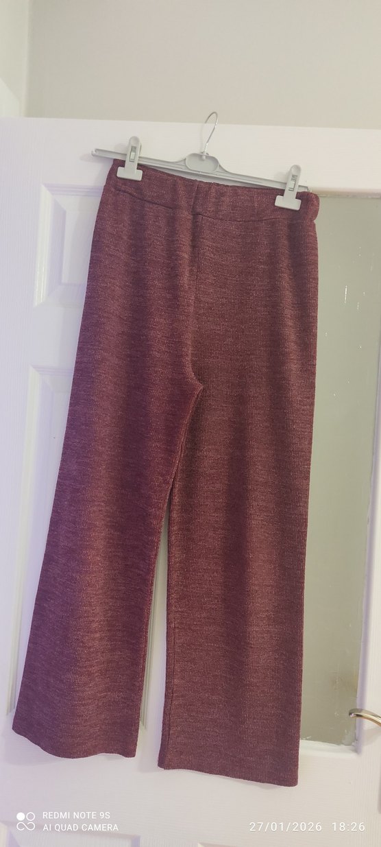Bordo renk, rahat kesim pantolon, yumuşak sentetik kumaştan üretilmiş, parlak görünümlü, günlük kullanıma uygun.