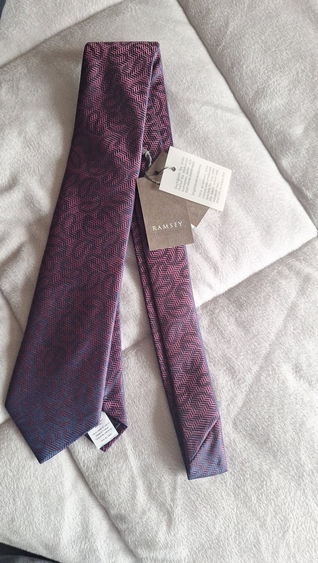 Ramsey markalı erkek kravat, koyu bordo renkte ve ince geometrik desenlidir. Klasik zarafet ve modern tarzı bir araya getirir.
