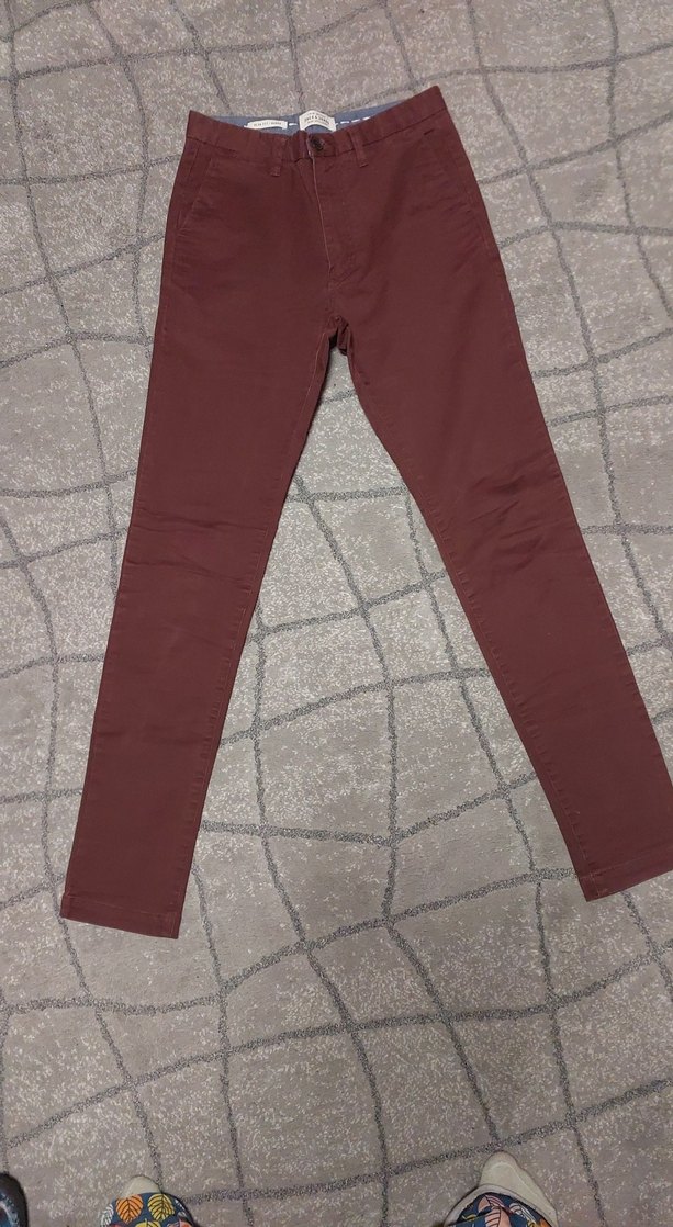 Bordo renkli, regular fit kesime sahip erkek pantolon, kemerli ve desensizdir. Sentetik kumaştan yapılmış olup günlük kullanım için uygundur. 28/32beden
