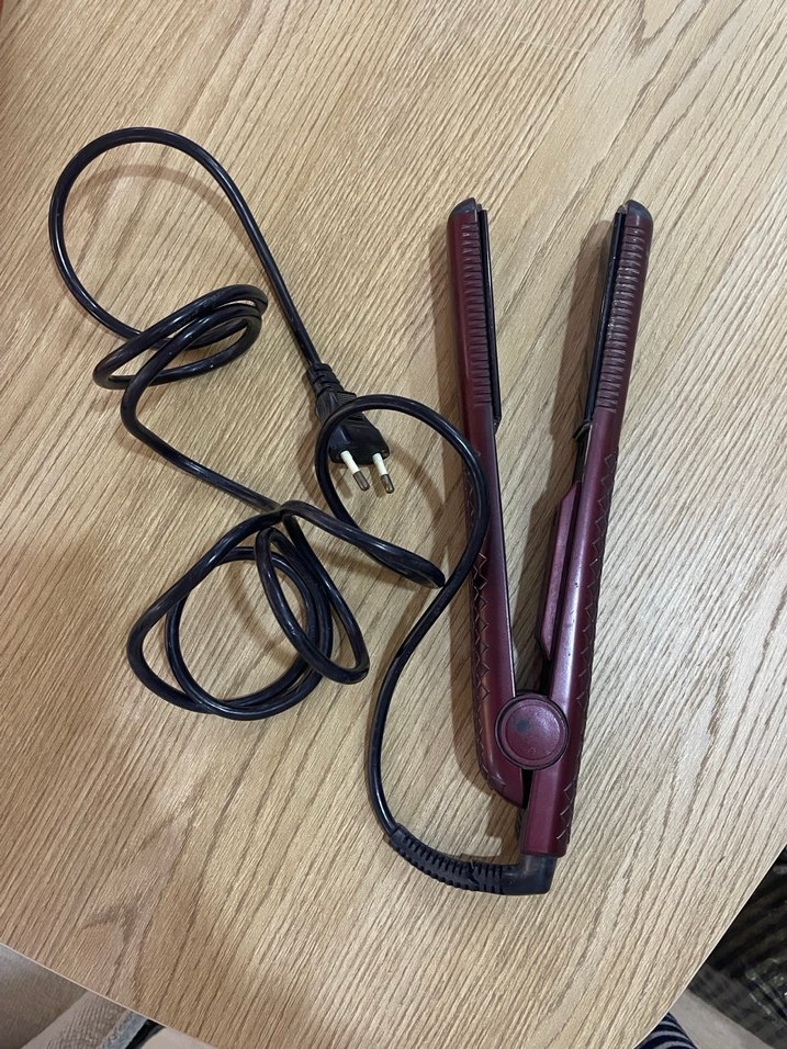 Uzun kablolu ve ince tasarımlı koyu bordo saç düzleştirici, hızlı şekillendirme için uygundur.
