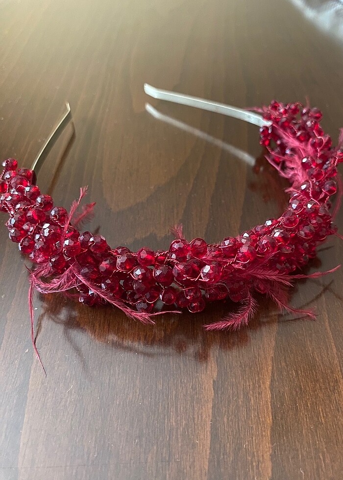 İki farklı taç almıştım. Bunu hiç kullanmadım. Bordo renk kına tacı. Tüyleri var.