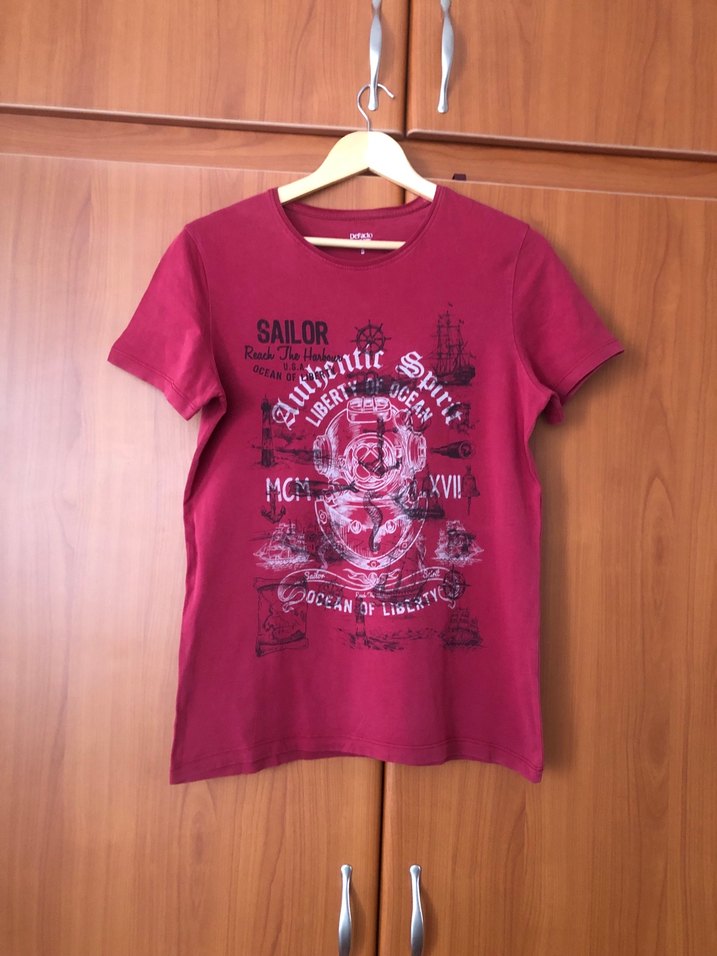 Bordo renkli, baskılı erkek tişört, yuvarlak yaka ve kısa kolludur. Sentetik kumaştan, rahat kesimlidir. 'SAILOR, XVI!, MCN' yazılı baskısı vardır. Günlük kullanıma uygundur.
