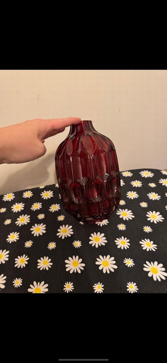 Koyu bordo renkli cam vazo, oval dokulu desene sahip. Dar ağızlı ve yuvarlak gövdeli, çiçek sergilemek için uygun.