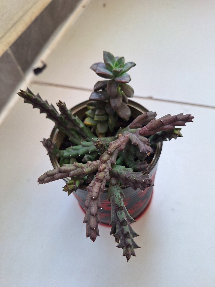 Küçük bir saksıda toprak içinde yetişen, yıldız şeklinde desene sahip koyu bordo renkli çiçekli sukulent.