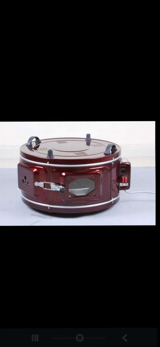 Bordo renkli elektrikli mini fırın, yuvarlak kompakt tasarıma, cam pencereye ve yan tarafta kontrol düğmelerine sahiptir.