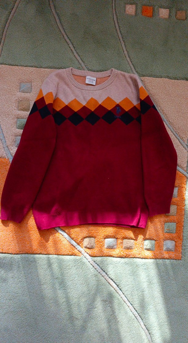 Bu erkek çocuk kazağı, triko dokuması, bol kesim ve uzun kollu yapısıyla dikkat çeker. Bordo, turuncu ve bej tonlarında renkli baklava desenlidir. Street wear tarzına uygundur.