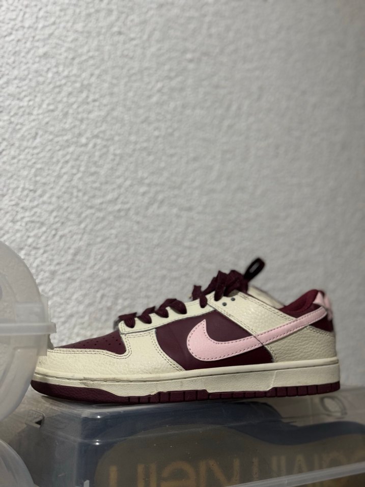 Bordo ve açık pembe tonlarında, topuklu ve fırfırlı detaylı kadın spor ayakkabısı. Kauçuk tabanlı, sportif ve şık tasarım.