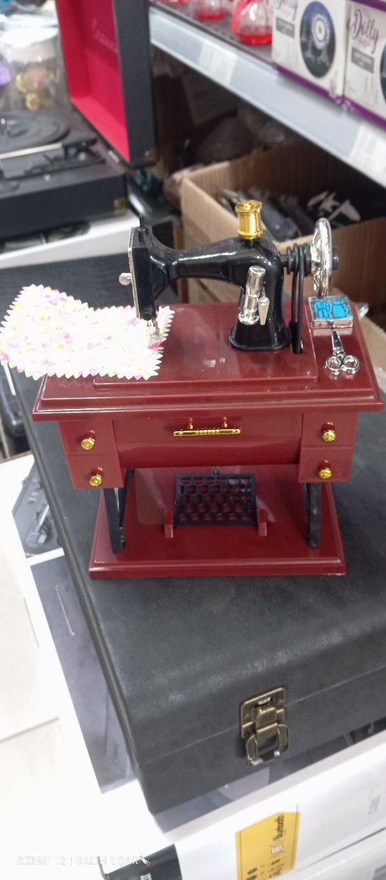Detaylı çekmeceleri ve ayak pedalı bulunan renkli bordo mini dikiş makinesi modeli, dekoratif amaçlıdır.