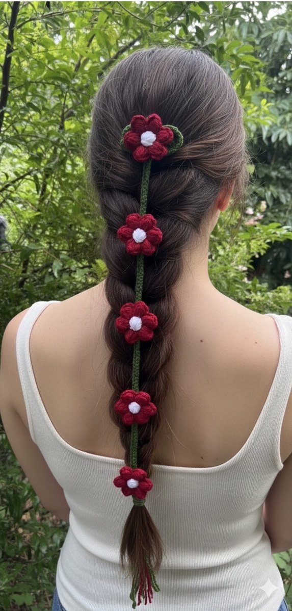 Bordo renkli, örgü çiçek desenli renkli saç tokası, bohem tarz için uygun.