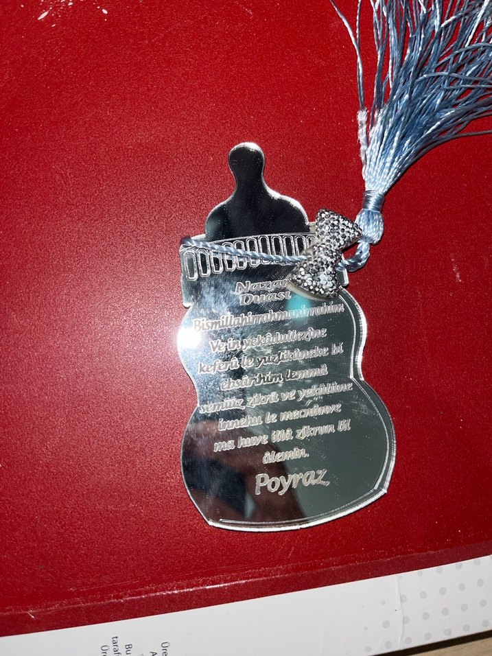 Bordo renkli, renkli tasarımlı bebek biberonu, üzerinde Poyraz ismi ve süs püskülü bulunuyor.