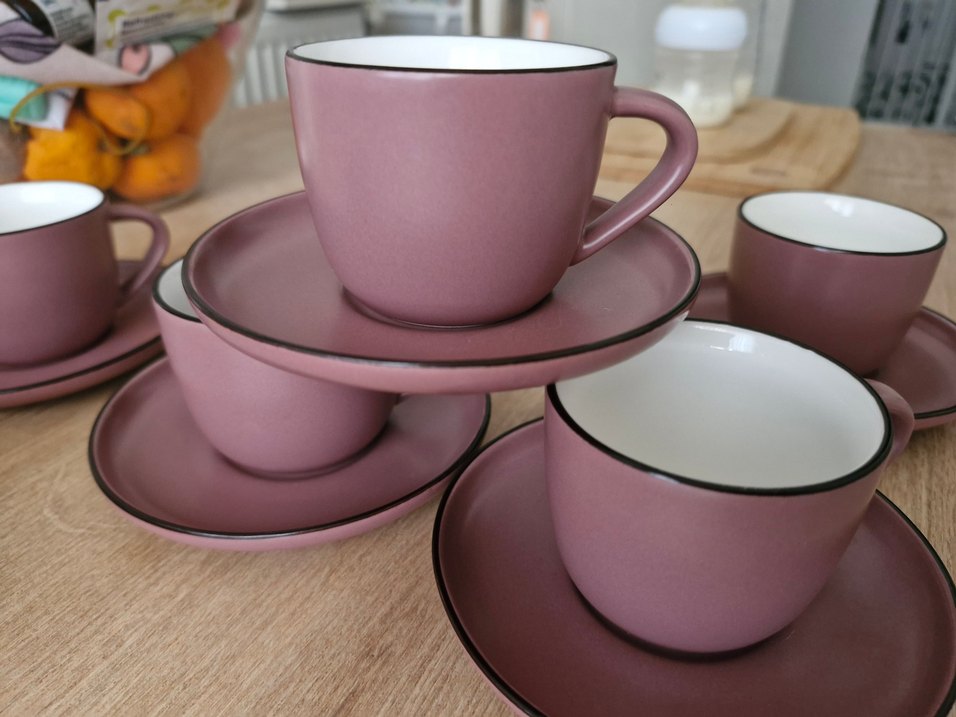 Bordo renkli seramik fincanlar, yumuşak mat doku ve ince siyah çizgili tabaklarla birlikte sunulmaktadır. ☕
