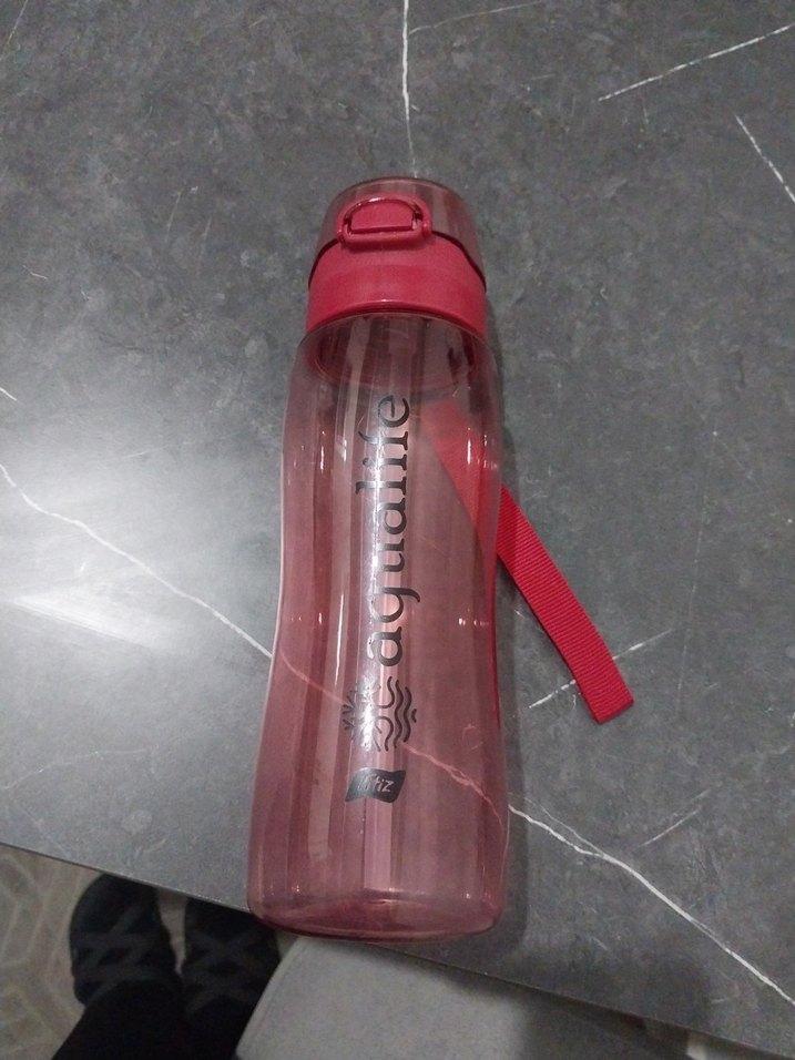 Bordo renkli, güvenli kapaklı ve taşıma kayışlı suluk.