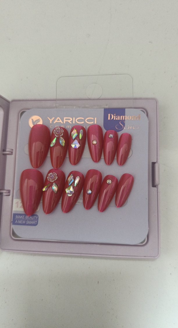 Bordo renkli tırnak süslemeleri, parlak taşlar ve çiçek detayları içerir. Yaricci markalıdır.