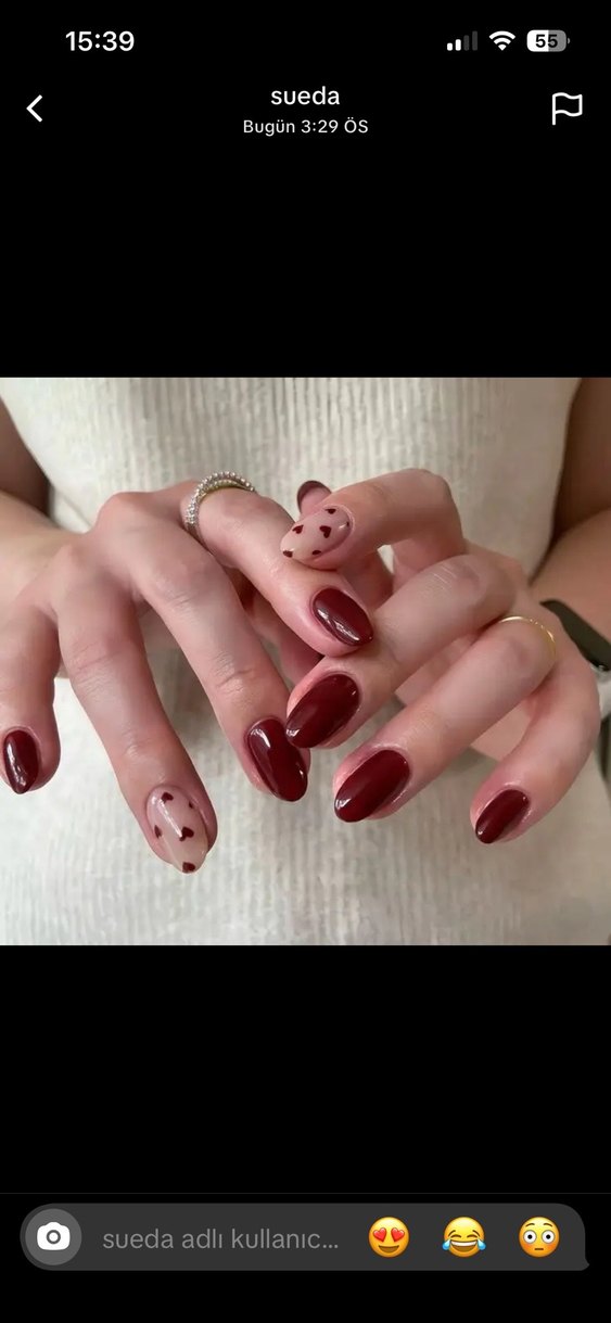 Parlak görünümlü koyu bordo renkli tırnak süslemeleri, bazı tırnaklarda küçük kalp desenleri bulunur.