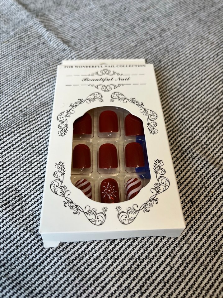 Bordo renkte, çizgili ve kar tanesi desenli çeşitli tırnak süslemeleri. 24 adet tırnak 24 adet yapıştırıcı bir adet törpü