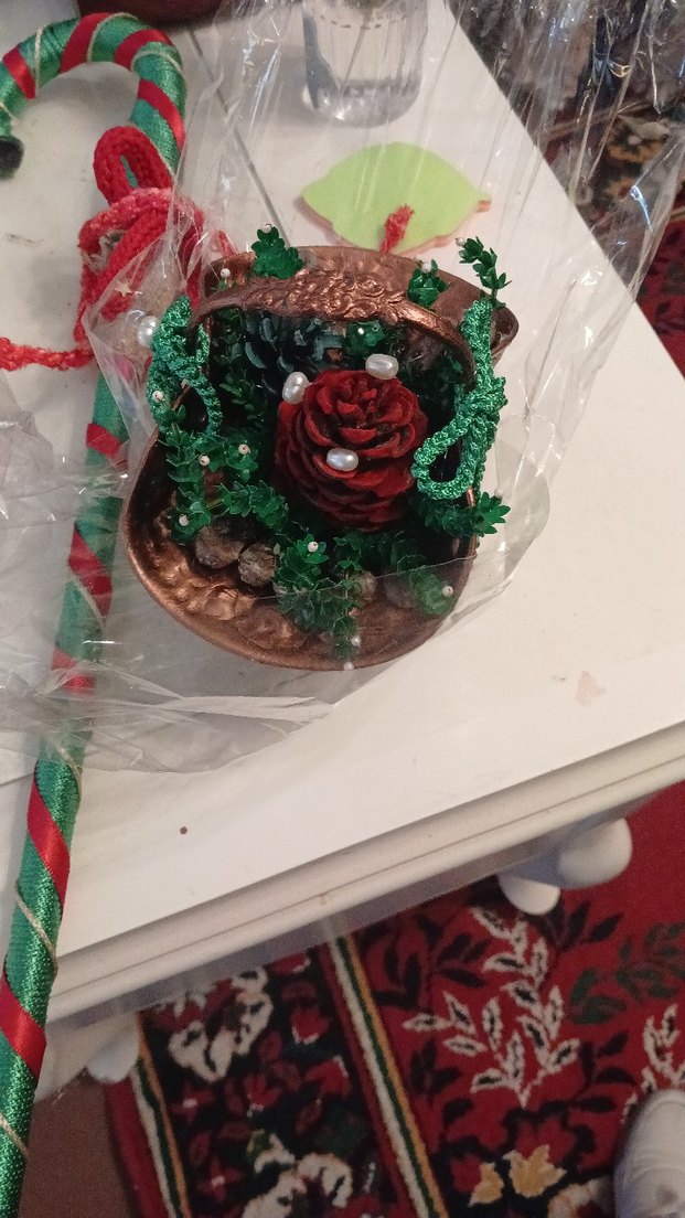Bordo renkli yılbaşı süsü, yeşil detaylar ve inci görünümlü boncuklarla süslenmiş kozalak içerir.