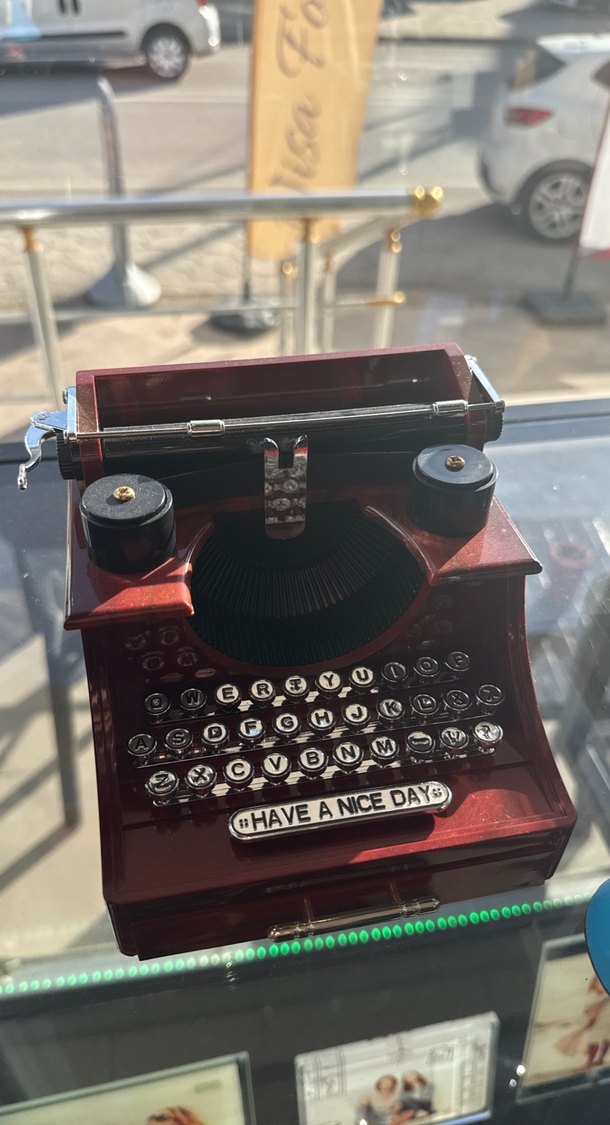 Koyu bordo renkte, yuvarlak tuşlu ve "HAVE A NICE DAY" yazılı dekoratif etiketli retro daktilo tasarımlı klavye. ️
