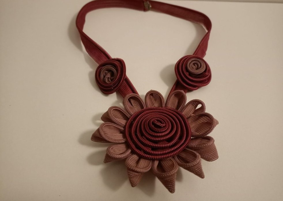 Bordo Retro Fermuar Tasarım Çiçekli Kolye