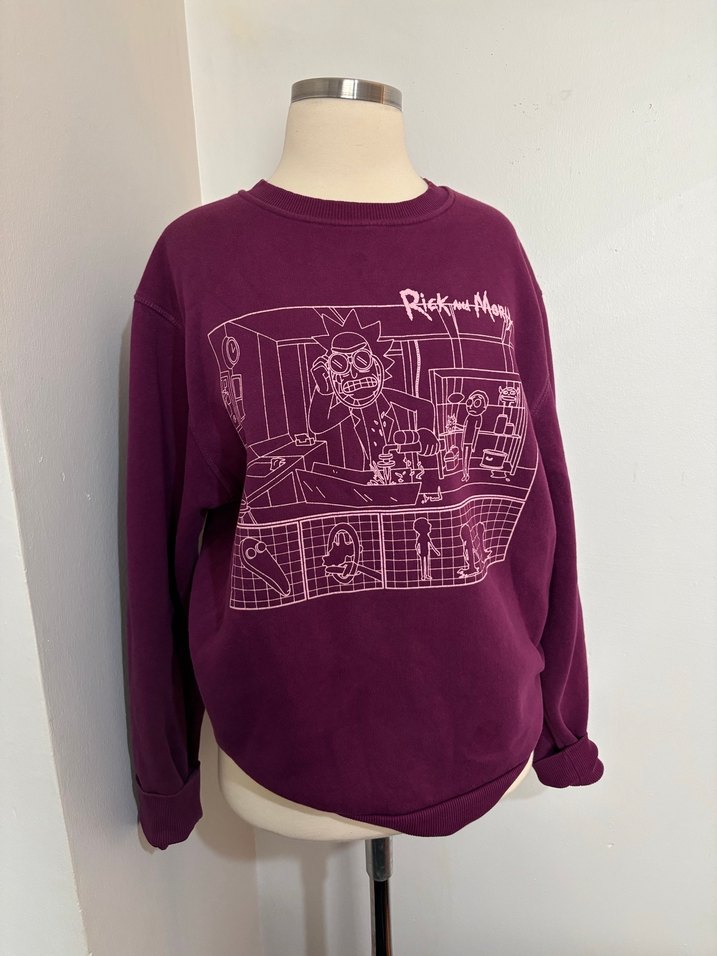 Rick and Morty temalı, uzun kollu, mürdüm renk sweatshirt. Günlük kullanım için idealdir. Son görselde belirttigim belli belirsiz lekeleri bulunmaktadır. Kullanıma engel degil.