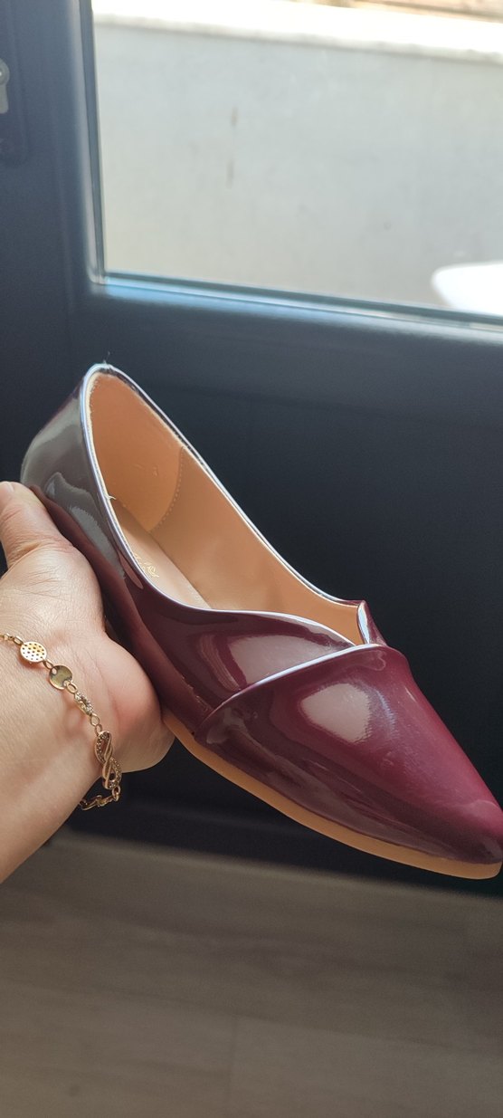 Bordo rugan görünümlü, babet kadın ayakkabısı. Klasik ve çağdaş tarzı birleştirir, günlük kullanıma uygundur.