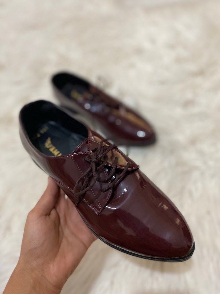 Bordo rugan, parlak yüzeyli kadın klasik ayakkabı,, günlük şık kullanım için uygun. Sıfır