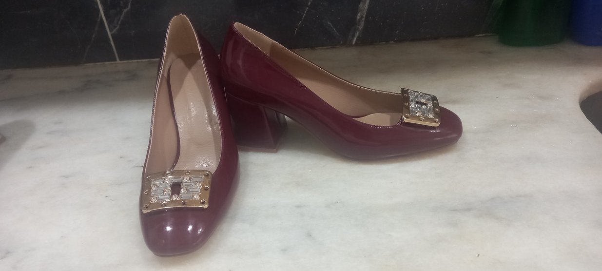 Bordo rugan kadın topuklu ayakkabılar, blok topuklu ve lastik malzemeden üretilmiştir. Parlak, desensiz tasarımıyla günlük kullanıma uygundur.
