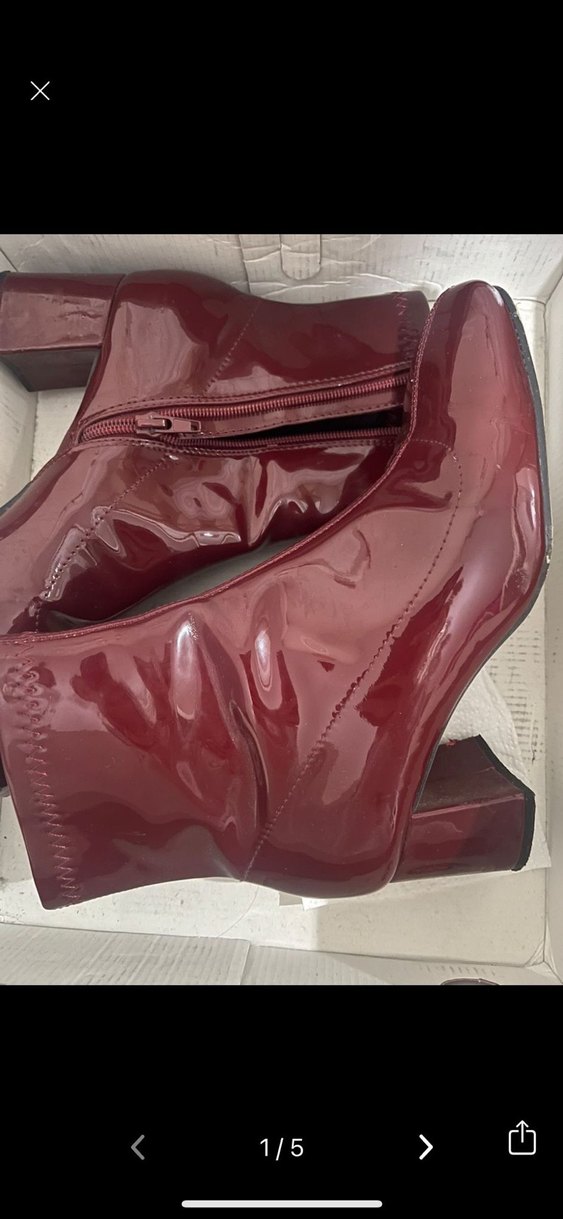Bordo rugan deri kadın botlar, blok topuklu ve parlak yüzeye sahip. 37 numara çok az kullanıldı. Zara markadır.