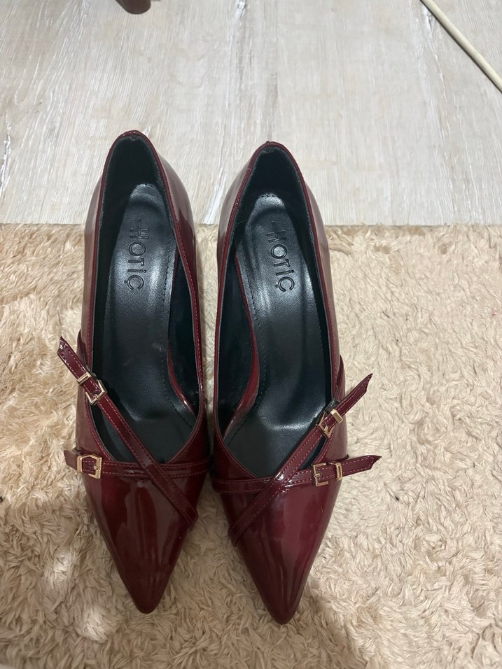 Bordo renkli, kemerli ve rugan görünümlü stiletto topuklu ayakkabı. Tertemiz.