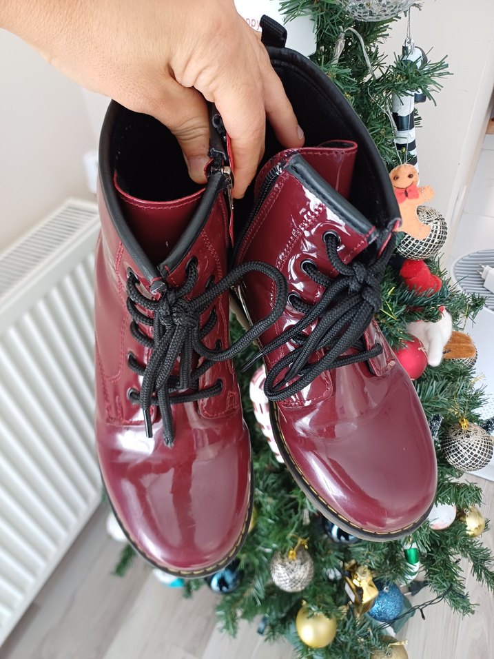 Bordo rugan görünümlü, 34 numara, bağcıklı,yandan fermuarlı kız çocuk botu. Goth ve grunge punk tarzında, parlak yüzeye sahip, desensiz model. Ayakkabı dünyasından almıştık. Kiddo marka. Az kullanılmıştır.
