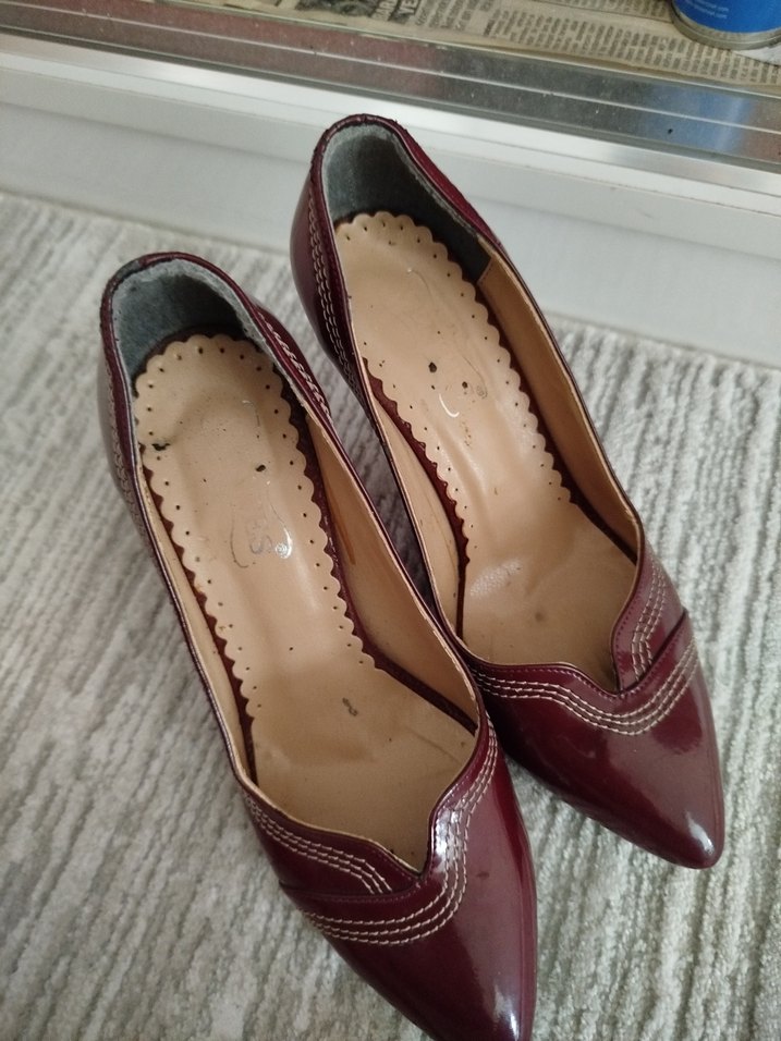Bordo rugan stiletto topuklu kadın ayakkabı, parlak yüzey ve pileli detaylarla klasik şıklık sunar, günlük kullanım için uygundur.