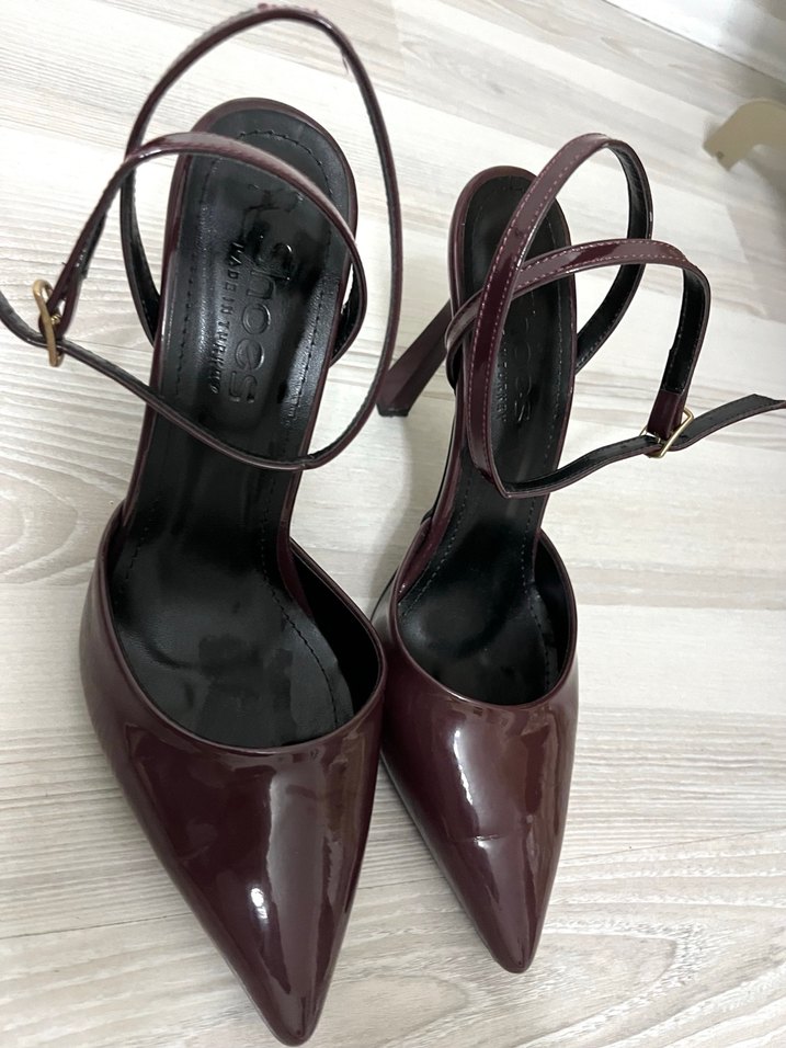 Bordo renginde, parlak yüzeye ve yılan derisi desenine sahip stiletto topuklu, kemerli bilekten bağlamalı kadın ayakkabısı.