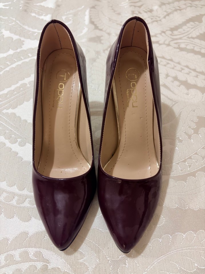 Ofis için uygun, bordo rugan stiletto topuklu ayakkabı. Klasik ve şık tasarım, kauçuk tabanlı.
