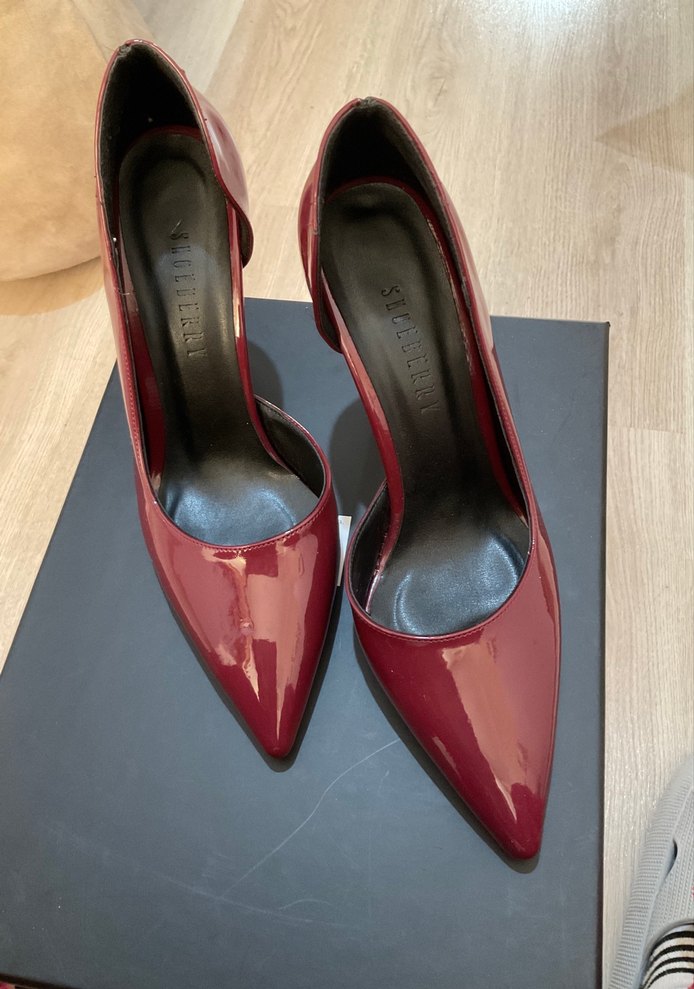 GENİŞ KALIP!!! Bordo parlak rugan malzemeden, stiletto topuklu kadın ayakkabı. Cesur Paris tarzını yansıtan modern klasik model, ofis kullanımı için uygun. 39 numara. Ben 40-41 numara giyiyorum kalıbı geniş olduğu için 39 numara uygun oldu.