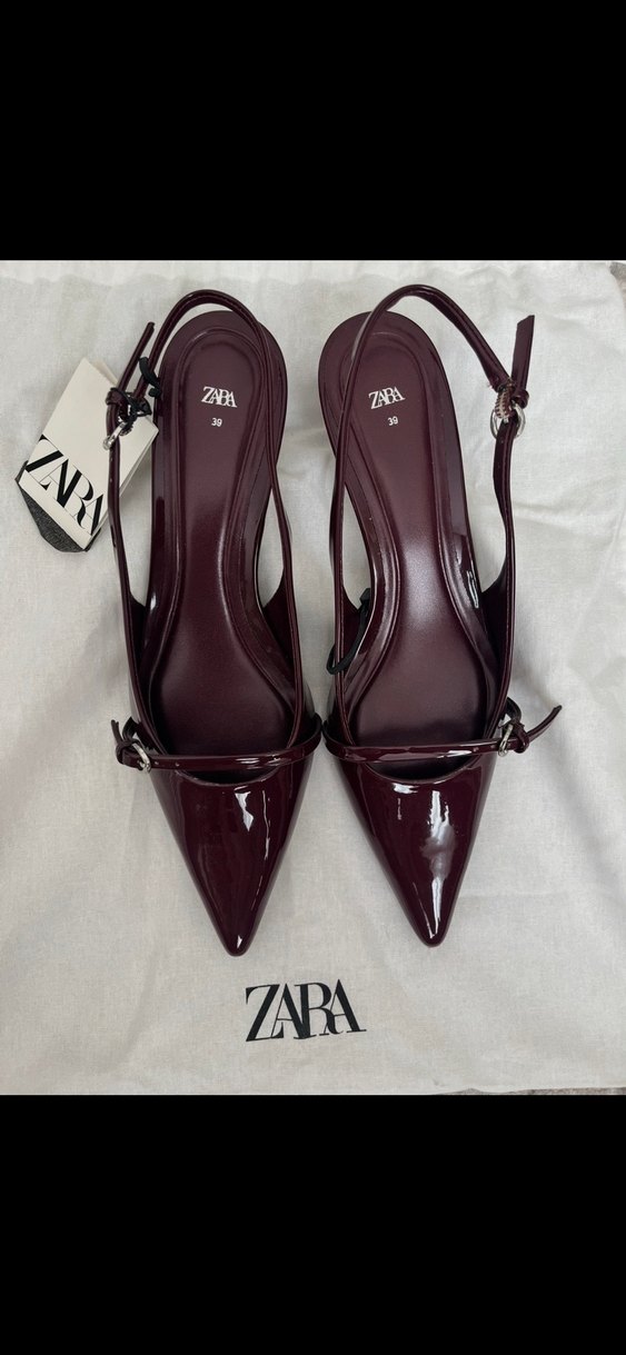 Zara'dan bordo rugan deri stiletto topuklu ayakkabılar, sivri burun ve tokalı kayış detayına sahip. Romantik gece için modern ve minimal tasarımda şık bir seçim.